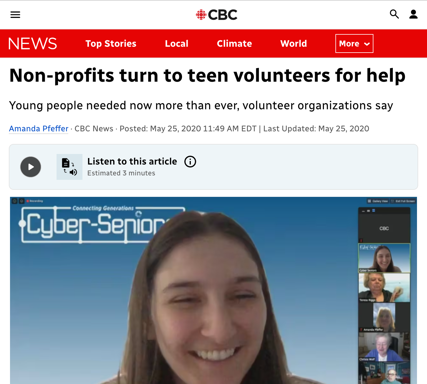 Cyber-Seniors program featured by CBC News for our work supporting older adults during Covid-19. Teen volunteers helped seniors stay socially connected and confident online when it mattered most.